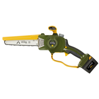 Ele vem com duas baterias que podem ser recarregadas simultaneamente graças ao seu carregador de 3 conectores, uma garrafa de óleo biodegradável e todas as ferramentas que você precisa para manter sua motosserra.